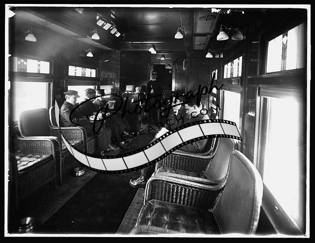 Buffet library car,deluxe overland limited train,railroad dining,passengers,1910