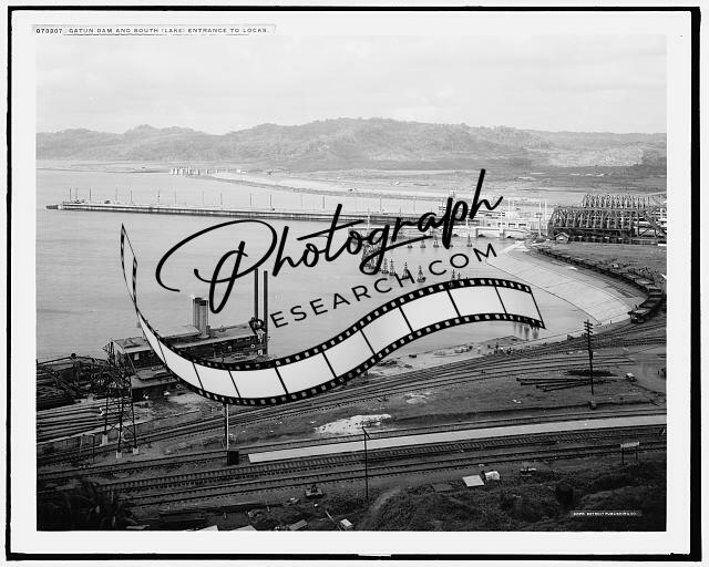 Gatun Dam,south lake entrance,locks,hydraulic egineering,tracks,boats,c1910