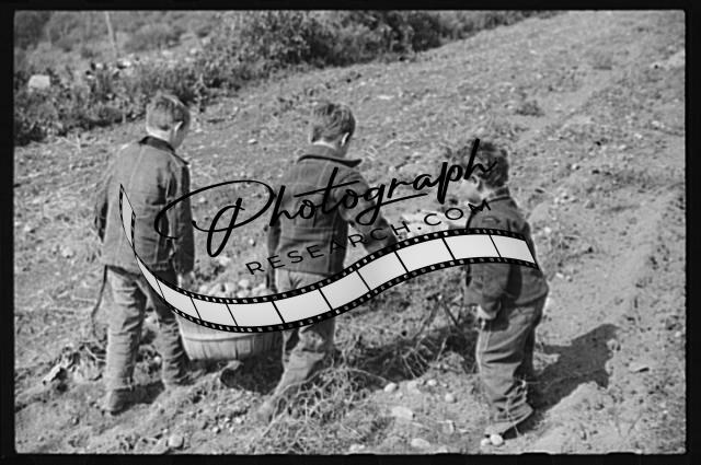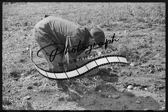 Title: William Gaynor, FSA (Farm Security Administration) dairy farmer, picking up potatoes on his farm near Fairfield, Vermont