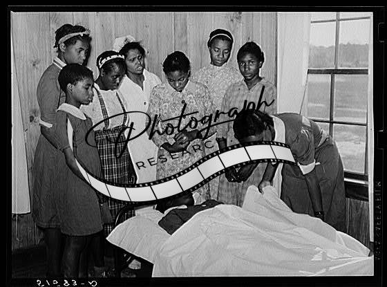 Title: Nurse Shamburg demonstrates care of baby bottles to Mrs. Paralee Coleman and Marie. Mothers have to work in field and children are left at home to care for babies. Health clinic, Gee's Bend, Alabama