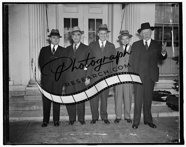 Title: General Electric head at White House. Washington, D.C., Nov. 10. Gerard Swope, President of General Electric, with other leading industrialists and business men, and federal officials, met with President Roosevelt today to discuss a housing program that involve the use entirely of private Capital.