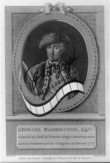 Summary: Print shows George Washington, full-length portrait, standing, facing slightly left, wearing uniform, holding hat in right hand; on the right, an African man holds Washington's horse. Includes remarque showing a Native American man holding crest.