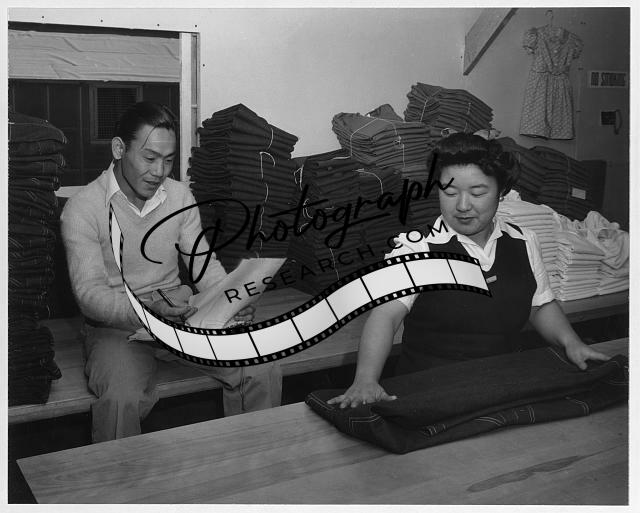 Bert K. Miura and Toshiko Kadonada, bundling and shipping, Manzanar Relocation Center, Cal.