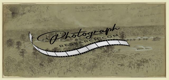 Inscribed below title on verso: This is one of the most delightful places in the Army although it is only a few hundred yards from the enemies front and a considerable distance in advance of Gen Smiths Head Quarters. It is situated in a small ravine as shewn in the sketch with a small brook running at each end completely out of the dust & cool in the hottest days. The birds build their nests in the trees above the tents and the squirrels play fearlessly around the quarters while the enemies and our own shot & whistle above their heads. Gen Stannard commands the First Division 18th Army Corps.