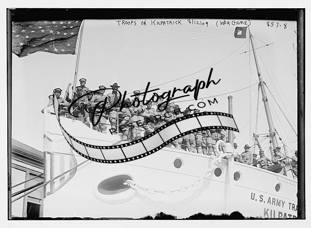 U.S. Army troops on trasport 'Kilpatrick' performing war games,ship,1909