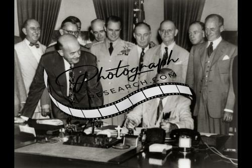 President Truman signing the new Unification Bill,1949,Russell,Johnson,Denfeld