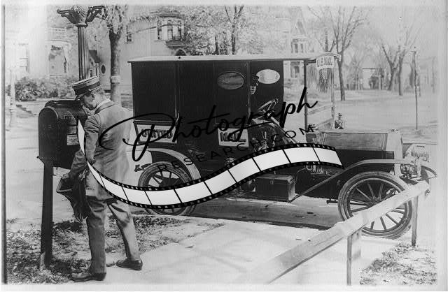 Mailman emptying mailbox,automobile marked United Mail,curb,1909-1932,Truck