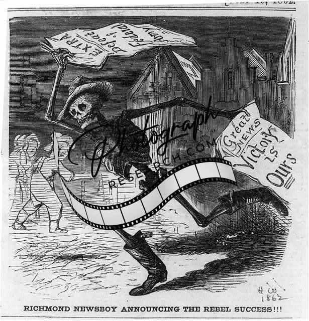 Richmond newsboy announcing the rebel success!!!,1862,skeleton,Civil War