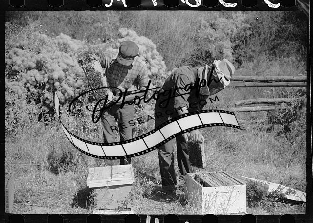 George Arnold,his son inspect some of the hives,farm,Chaffee County,Colorado,1