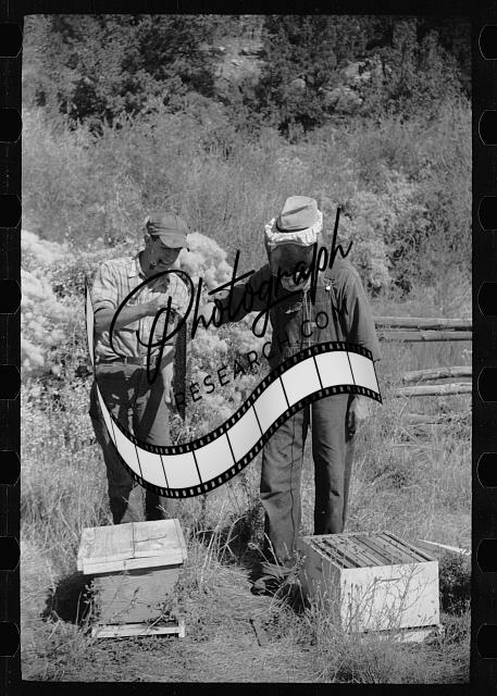 George Arnold,his son inspect some of the hives,farm,Chaffee County,Colorado,1