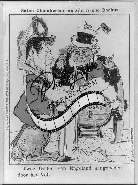 Dutch cartoon showing Joseph Chamberlain as Satan,John Bull as Bacchus,1897?