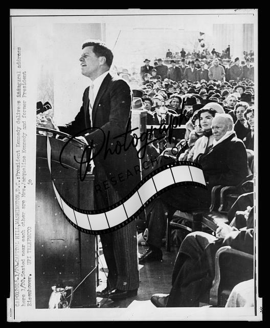 President Kennedy delivers inaugural address here [Capitol Hill, Washington, D.C.] 1/20. Seated near each other are Mrs. Jacqueline Kennedy and former President Eisenhower