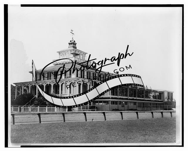 Photograph shows exterior view of the Old Members Clubhouse at Pimlico track in Baltimore, Maryland, prior to the Preakness Stakes.