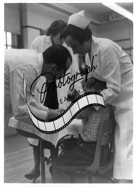 Dr. Jonas Salk innoculating a boy,as two nurses assist him,1954,Vaccination