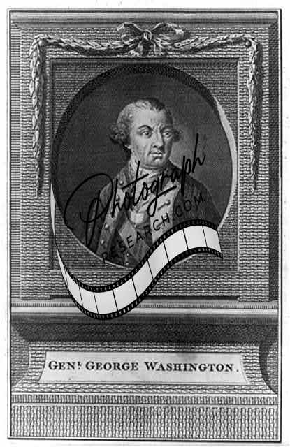 Summary: Print shows George Washington, full-length portrait, standing, facing left, wearing military uniform, gesturing with right hand holding a swagger stick, left hand resting on cannon barrel, military camp in the background.