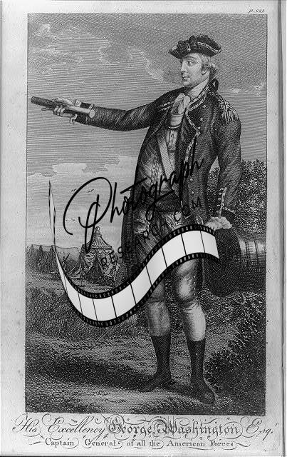 Summary: Print shows George Washington, full-length portrait, standing, facing left, wearing military uniform, gesturing with right hand holding a swagger stick, left hand resting on cannon barrel, military camp in the background.