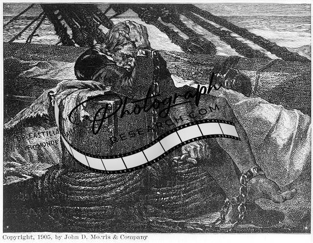 Christopher Columbus returning to Spain in chains,on board ship,c1905,Capture