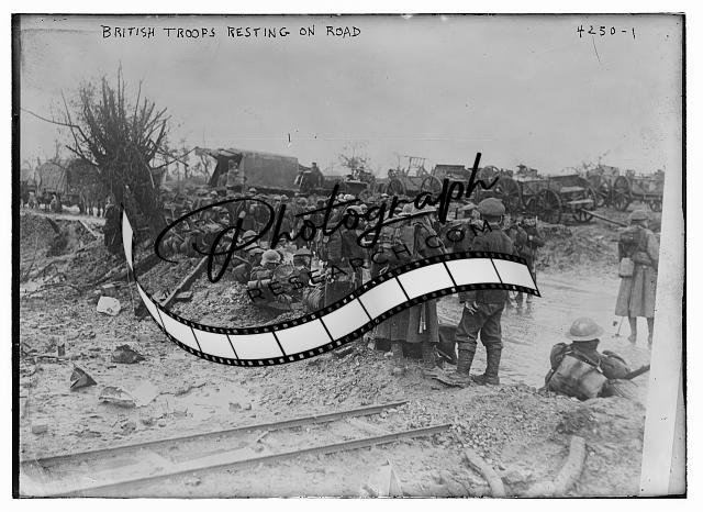 British troops resting on road,Military,soldiers,automobiles,Bain News Service