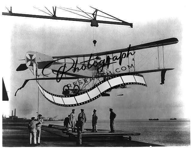 German sea plane being lowered by crane onto water,1914-1918,aviation