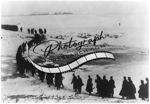 Column of Grenadiers walking across frozen river,South Caucasus,Russia,1942,WWII