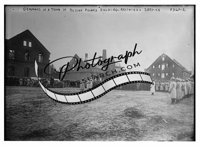 Germans in a town in Russian Poland holding Religious service,soldiers,damage