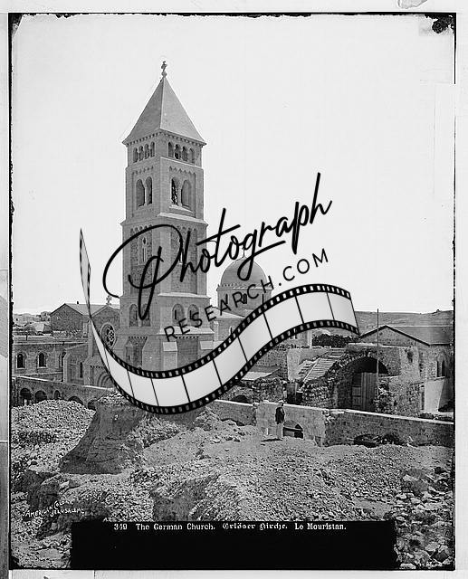 Caption from Catalogue of photographs made by the American Colony ... 1914: 'Jerusalem (El-Kouds). German Lutheran church.'
