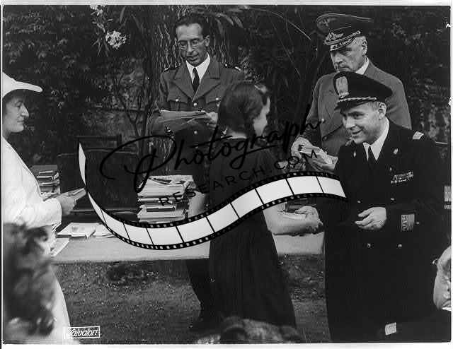 German officials of the Deutsche Akademie presenting diplomas and prizes to Italian fascist youth, Rome: official presenting book to girl