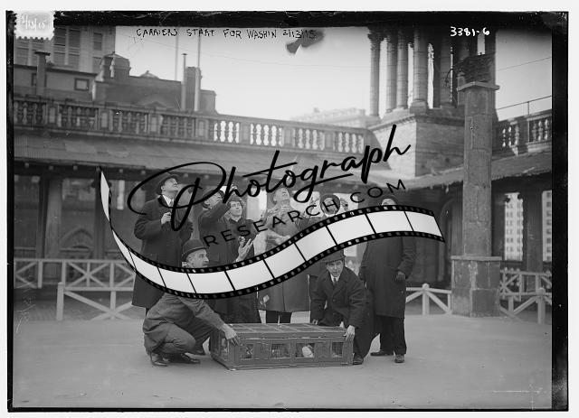 Carriers start for Washington,February 13,1915,men,birds,cage,Bain News Service