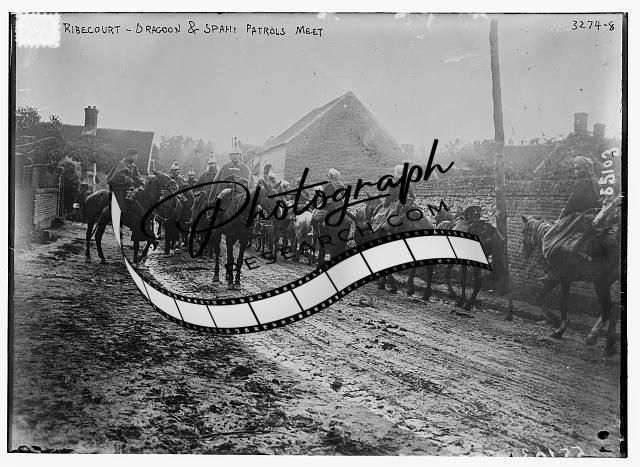 Ribecourt,France -- Dragoon,Spahi Patrols meet,men on horseback,muddy road