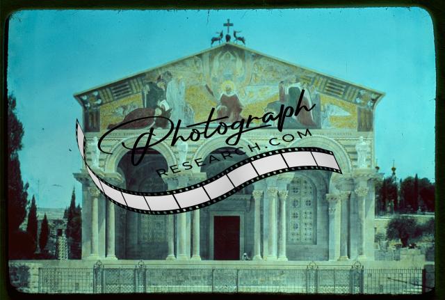On slide mount: Garden of Gethsemane. Golden Gate seen in the distance.