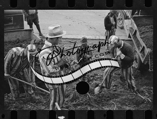 Convicts working,state road,workers,digging,shovels,trucks,North Carolina,1936