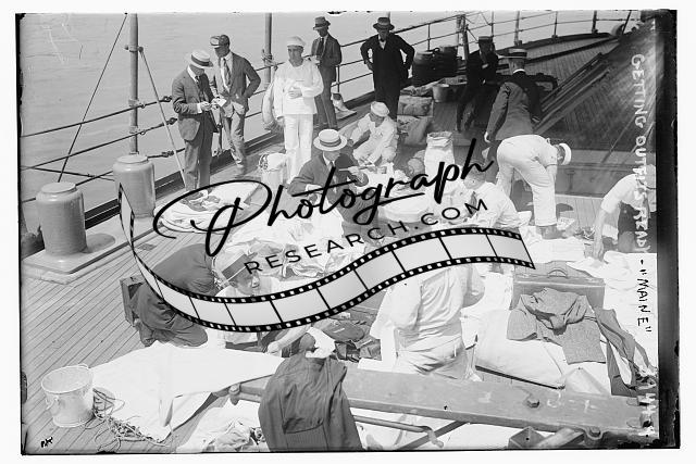 Getting outfits ready,MAINE,suitcases,sailors,deck of ship,vessel,Bain News
