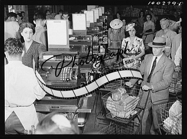 Title: Washington, D.C. Shopper watching the weighing of a chicken in the Giant Food shopping center