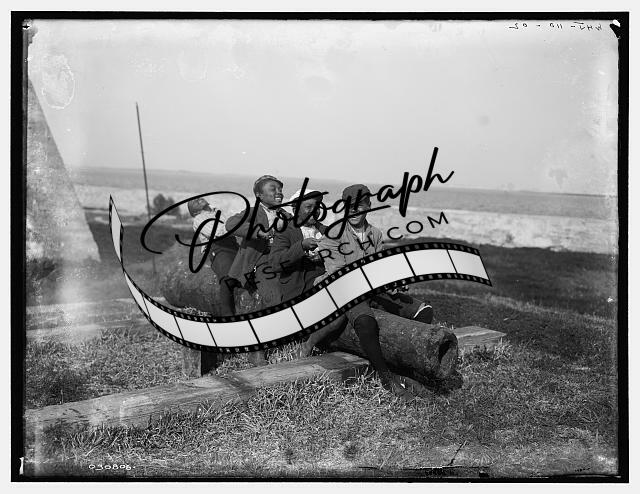 Four black boys sitting,cannon,playing,waterfront,African American children,1902