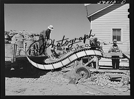 Title: Truckloads of potatoes in front of sorting, grading, and bagging sheds. From here they are shipped to all parts of the country. Gilcrest, Colorado