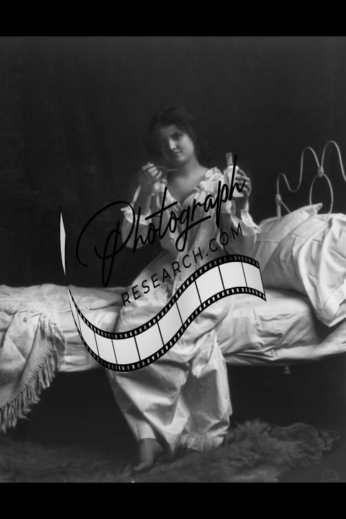 Woman seated on bed,taking spoonful of medicine,Sentimental,Bed Time,c1905