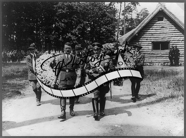 Arrival of Hitler; escorted by Goering in Carinhall for burial of Carin Goering