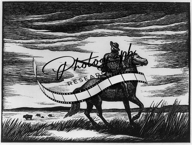 Man in buckskin with gun on horseback looking at herd of buffalo,Frontiersman