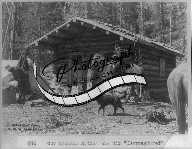 Idaho,man on horseback,thoroughbred,log cabin,c1903