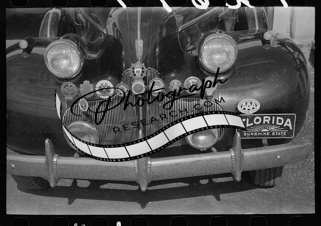 Insignias on tourist's car seen in Silver City,New Mexico,NM,FSA,Automobile