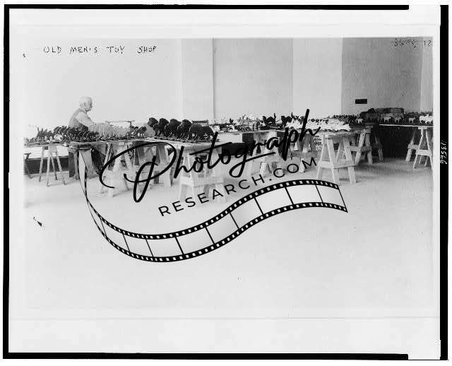 Old men's toy shop,large room,make-shift tables covered in toys,c1915,employment