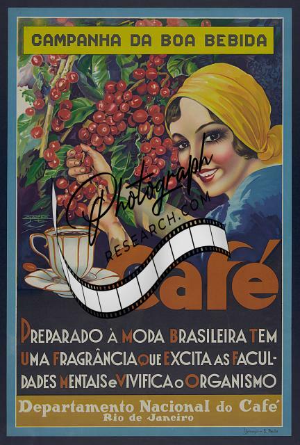 Cafe,Poster shows a woman holding coffee cup while picking coffe beans,c1940