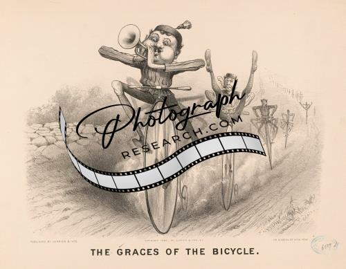 Graces of the Bicycle,c1880,Currier & Ives,Photo,trumpet,Penny-farthing,men
