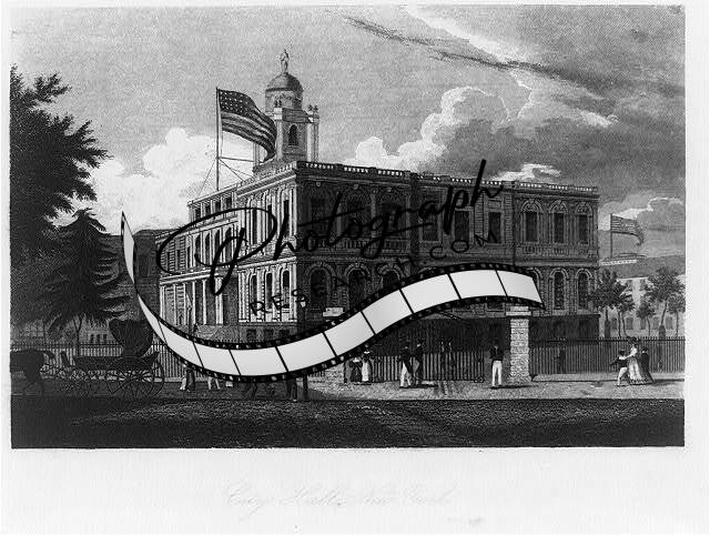 City Hall,New York,NY,c1850,American Flag,Clouds,Horse Drawn Carriage,People