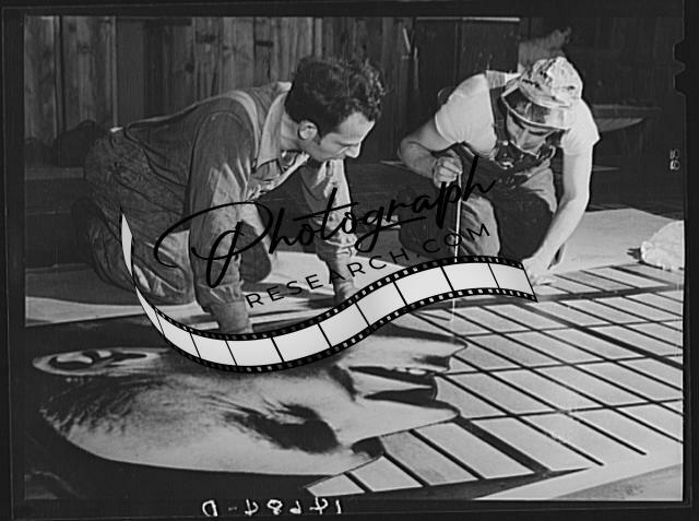Title: New York, New York. Preparing the defense bond sales photomural, designed by the Farm Security Administration, to be installed in the Grand Central terminal, in the shop of a contractor. Mounting the agricultural panel on homosote board with flour paste
