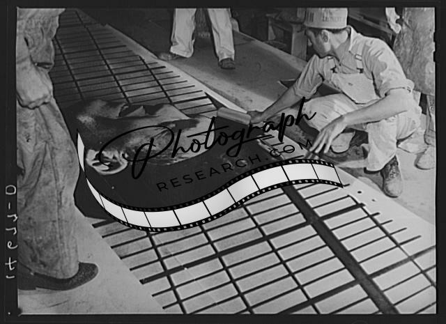 Title: New York, New York. Preparing the defense bond sales photomural, designed by the Farm Security Administration, to be installed in the Grand Central terminal, in the shop of a contractor. Mounting the center panel on the homosote board with flour paste