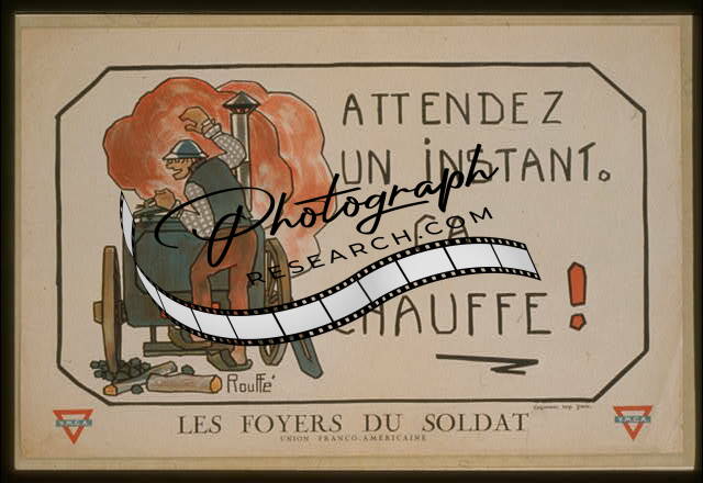 Summary: A French infantry soldier in uniform and with a gun. Surrounding him is a laurel wreath, and above him is the figure of 'La Marseillaise.'