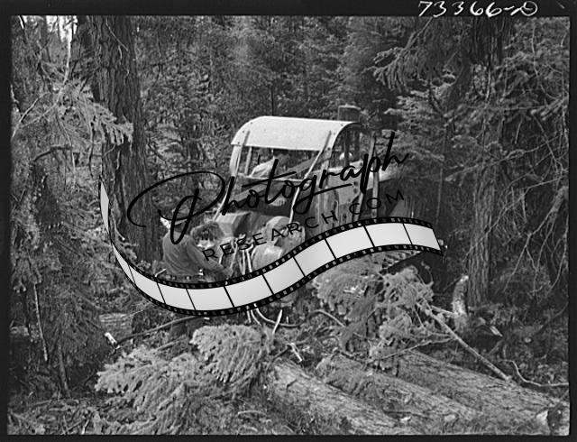 Title: Grant County, Oregon. Malheur National Forest. Diesel caterpillar tractor snaking logs out of woods