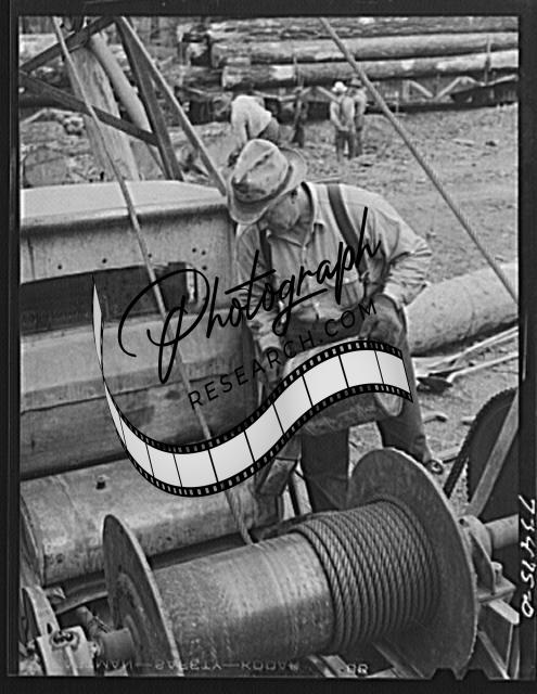 Title: Grant County, Oregon. Malheur National Forest. Lumberjack hitching cable on log which will be loaded onto truck