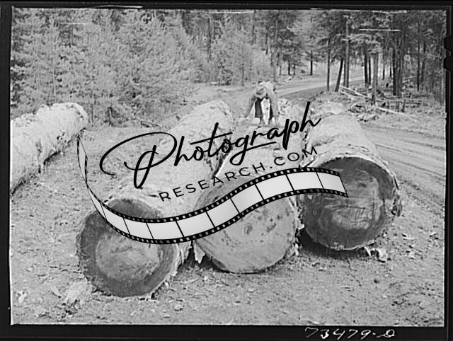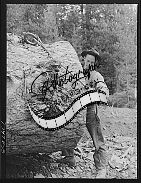Title: Grant County, Oregon. Malheur National Forest. Lumberjack hitching cable on log which will be loaded onto truck